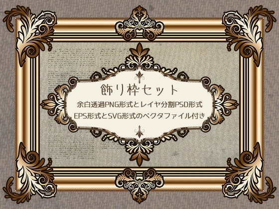 Inkscapeで作ってみたアンティーク調の飾り枠の詰め合わせです。 商用利用可、加工自由です。 余白透過済みPNG形式とレイヤ分割PSD形式のほか、 Adobe Illustratorなどで使えるEPS形式とInkscape用SVG形式のベクタファイルをセットにしてありますので 線の劣化を気にせずご自由に拡大縮小や回転などを行っていただけます。 また、PSD、EPS、SVGの各ファイルには枠を構成するパーツも入れてありますので 必要なキャンバスの大きさに合わせてご自由に配置していただくことが可能です。 それと今回は体験版にもPSDやEPS、SVGの各ファイルを用意していますので ご購入前にぜひ体験版にて当素材がどういうものか確認してみてください。 【素材情報】 《画像形式》 PNG、PSD、SVG、EPS (Adobe Illustrator CS以降対応) 《収録数》 飾り枠8種類+1(+1は体験版用の飾り枠です) 《ファイルサイズ、解像度》 2400*3200px、600dpi (おまけの飾りだけを分けたもののみ2000*2000px、600dpi)サンプル