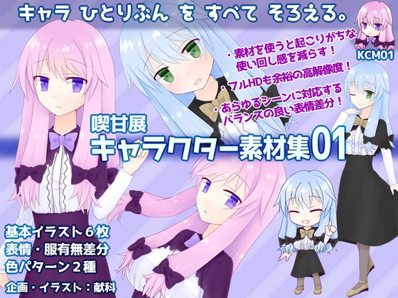 キャラクター1体の立ち絵・イベントCG2種・SDキャラ・全身図・デフォルメ顔アイコンがセットになった素材集です。 ゲーム制作者本人のだいぶ現実的な需要に基づき制作しておりますが、他の用途にも使えそうでしたらどうぞ。 【こんな人にオススメ ≒ こんな人が作った素材です】 ・立ち絵をあまり使い回したくない、同じキャラのイベントCGも欲しい ・一枚絵はともかくとしても、細かい素材やキャラデザまで頼むと予算が足りない ・作風や専門分野の違いなどで、イラストレーターにイメージを伝えるのが難しい ・むしろキャラについてはイメージが無い、素材先行で内容を考えたい ・画面自体が大きかったり、アップ描写を使ったりするので解像度が足りなくなりがち 【収録素材】基本6種(Ver1.2時点) 全て背景透明のpng画像です。加工は縮小・トリミング・単純な重ね程度で済むように作っていますが、 余裕でフルHD(1920×1080)に使えるくらい素の面積があるので、全く無加工で使うのはオススメしません。 すべての素材に桃髪紫目と水髪緑目の2つのカラーパターンがあります。 デフォルメ顔アイコン以外は、服無し差分(乳首・局部無しの裸)も収録しています。 ◇立ち絵(stand) 平時の会話シーンなどに使う立ち絵です。5.5頭身相当くらいの絵柄です。 太腿から上 タテ1700×ヨコ1200 表情差分12種 ◇全身図(portrait) ちょっとポーズ付けた全身図。立ち絵とは別ポーズです。 タテ1800(上余白込)×ヨコ900 表情差分3種 メニュー画面、ステータス画面、キャラ紹介などに、基本引きで使います。立ち絵の使い回し感を軽減。 ◇汎用イベントCG2枚(evcg) イベントシーンやタイトル画面向けの汎用スチル(やや傾いたバストアップ)です。 ヨコ2000(左右余白込)×タテ1500 表情差分各9種 加工時に切れないよう、キリの良いところまで描いてあります。 使用時には全体をそのままではなく、ある程度端を切ったほうがそれっぽいと思います。 あえて目元を見切れさせて胸あたりを中心にしてもエロ……エモいです。 ◇SDキャラ(sd) 2.5頭身くらいのチビキャラです。 タテ1000×ヨコ800 表情差分4種 チュートリアル・キャラが多数いる選択画面・微妙にスペース空いちゃった時などに使います。 ◇デフォルメ顔アイコン(faceico) デフォルメ顔のみのアイコンです。SDより大胆に髪などを縮め、顔周辺だけで完結するようにしたものです。 頭上~肩口まで タテヨコ500 表情差分4種 素材集では滅多に見かけないのですが、私は名前表示の補助にしたり、スペースが厳しいシステム系の画面に置いたりします。 おまけ素材 ・RPGツクールMV及びMZ規格の顔グラフィック(収録素材の顔部分の切り抜き 1枚あたりタテヨコ144) ・紹介画像で使用しているシンプルな斜めストライプの背景(ヨコ2400×タテ1800) 【利用規約】 素材を主とした販売・再配布、素材作者を偽る行為を禁じます。 クレジット表記任意(してもしなくても問題ありません)。 成人向けや有償作品、ゲーム作品以外での利用も可能です。 ※利用規約は製品に日本語・英語のものを同梱しています。 【補足事項】 この素材のキャラクターの判別のための名称はKCM01です。 使用用途に応じた素材の加工・改変が可能です。改変素材は元素材と規約上同じとなり、素材主体の配布・販売はできません。 『喫甘展キャラクター素材集』シリーズ同士は同規格です。他の当サークル有料素材集の同素材種名の素材(立ち絵等)も同規格です。