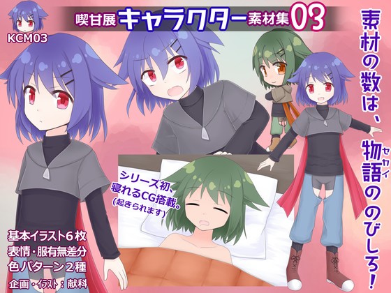 キャラクター1体の立ち絵・イベントCG2種・SDキャラ・全身図・デフォルメ顔アイコンがセットになった素材集です。 汎用素材を使うと起こりがちな基本CG少ない感を軽減しつつ、オーダーメイドよりお手軽に、あなたの作品を彩ります! このキャラクターは性別を特定できる身体的特徴を極力潰しています。小柄めな成人背丈のつるぺたボディです。 また、感情の振り幅が大きいため、表情差分が同シリーズ01~02より多くなっています。 【収録素材】基本6種+α (Ver1.0時点) 全て背景透明のpng画像です。加工は縮小・トリミング・単純な重ね程度で見栄えするように作っています。 すべての素材に青髪赤目白肌(c0)と緑髪橙目褐色肌(c1)の2つのカラーパターンがあります。 服無し差分(乳首・局部無しの裸)も収録しています。ヘアピンは服扱いです。 ◇立ち絵(stand) ヨコ1200×タテ1700 太腿から上 表情差分20 通常の会話シーンなどを想定しており、表情差分が最も多いです。 ◇全身図(portrait) ヨコ900×タテ1800 表情差分6 立ち絵と異なるポーズの全身イラストです。キャラ紹介やステータス画面などにどうぞ。 ◇イベントCG×2枚(evcg) ヨコ2000×タテ1500 上半身 表情差分各10 イベントシーンの挿絵を想定したイラストです。 加工時に端が足りなくならないよう、上半身が全て収まるようにしております。 使用時にはちょっと寄りにトリミングし直した方がそれっぽいです。 ☆おやすみセット ベッド(背景)、掛け布団(前景/色3色) ヨコ2000×タテ1500 ファンタジーマップチップで何故かよく見る、白シーツ敷いた木のベッドと、色ついた掛け布団の画像です。 ベッドを下に敷いて、イベントCGBをそのまま上に重ねると寝れます。お好みで掛け布団もどうぞ。 あまり厳密に影がついていないので、位置合わせをすれば他の素材も寝かせられます。 ◇SDキャラ(sd) ヨコ800×タテ1000 表情差分4 2.5頭身程度のちびキャラです。後ろ側のデザイン資料にもなります。 ◇デフォルメ顔アイコン(faceico) タテヨコ500 頭のみ 表情差分6 選択画面や名前表示の補助など、スペースが限られる場所にご利用ください。 おまけ素材 ・RPGツクールMV及びMZ規格の顔グラフィック(収録素材の顔部分の切り抜き 1枚あたりタテヨコ144) ・紹介画像で使用している薄赤色の背景(ヨコ2000×タテ1500) 【利用規約】 素材を主とした販売・再配布、素材作者を偽る行為を禁じます。 クレジット表記任意(してもしなくても問題ありません)。 成人向けや有償作品、ゲーム作品以外での利用も可能です。 ※利用規約は製品に日本語・英語のものを同梱しています。 【スタッフ】 企画・イラスト:献科 【補足事項】 この素材のキャラクターの判別のための名称はKCM03です。 使用用途に応じた素材の加工・改変が可能です。 改変素材は元素材と規約上同じとなり、素材主体の配布・販売はできません。 『喫甘展キャラクター素材集』シリーズ同士は同規格です。 また、他の当サークル有料素材集の同素材種名の素材(立ち絵等)も同規格です。サンプル